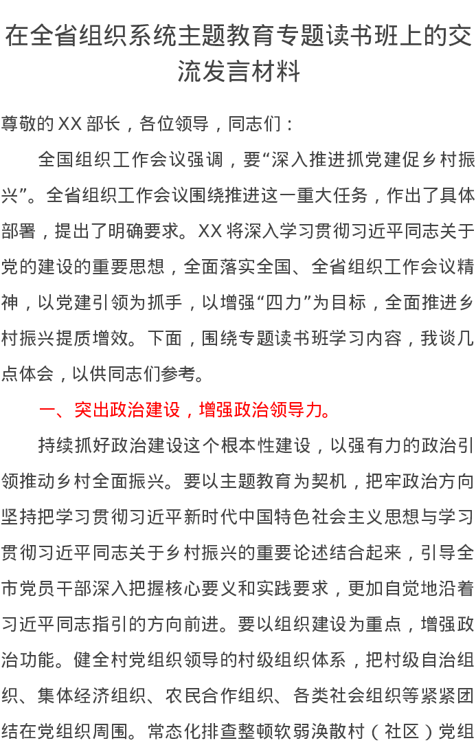 在全省组织系统主题教育专题读书班上的交流发言材料(特色社会主义思想)