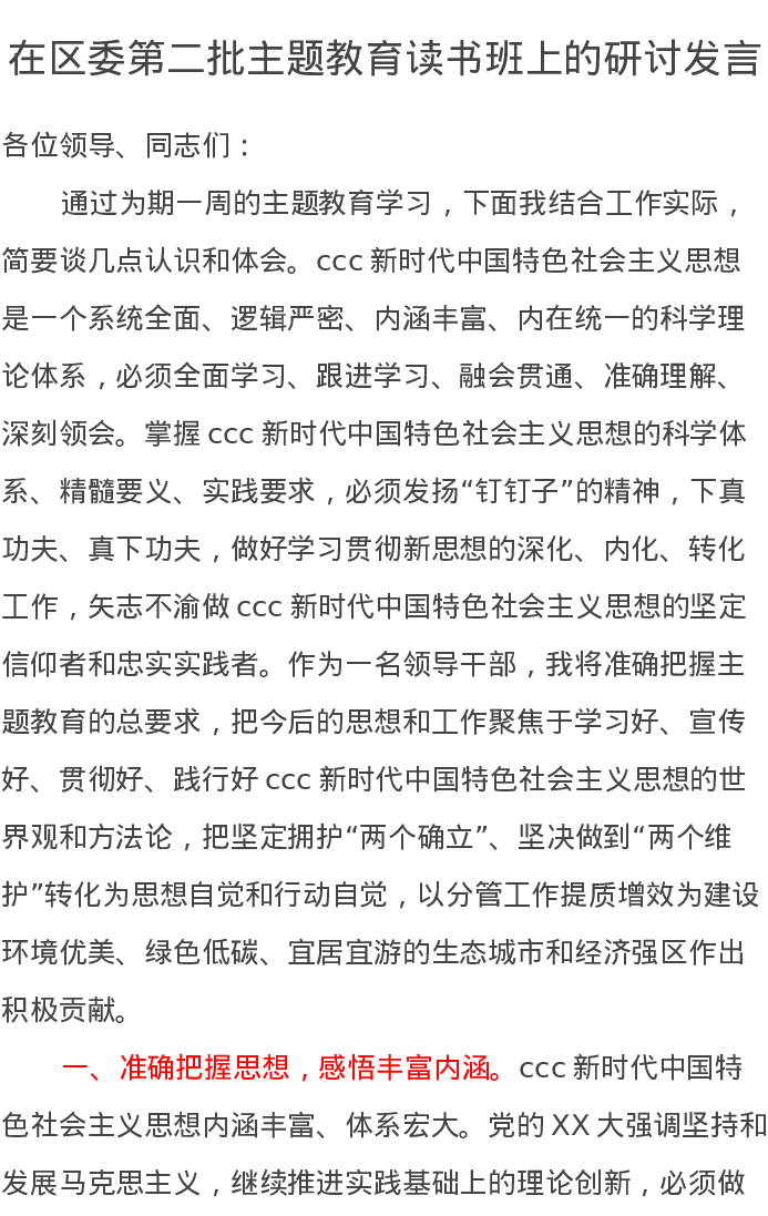在区委第二批主题教育读书班上的研讨发言(特色社会主义思想)