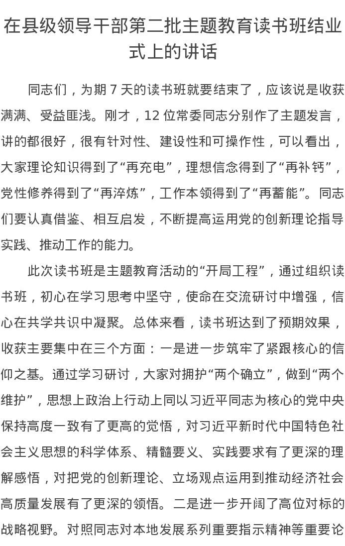 在县级领导干部第二批主题教育读书班结业式上的讲话(特色社会主义思想)