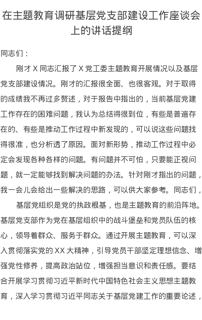 在第二批主题教育调研基层党支部建设工作座谈会上的讲话提纲(特色社会主义思想)