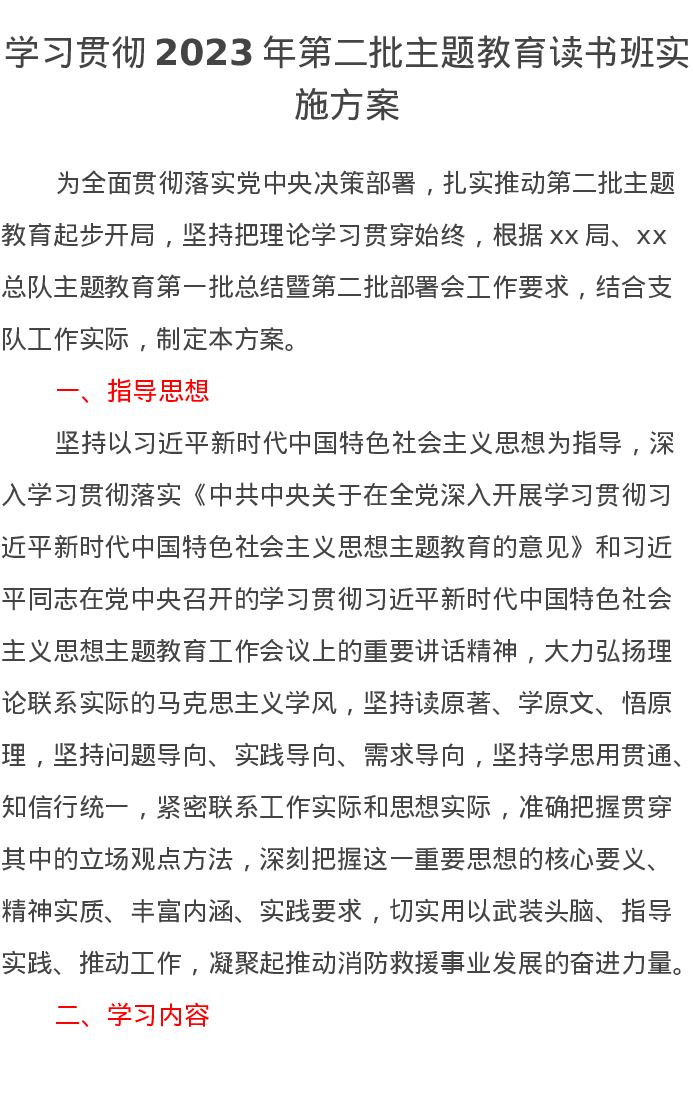 学习贯彻2023年第二批主题教育读书班实施方案(特色社会主义思想)