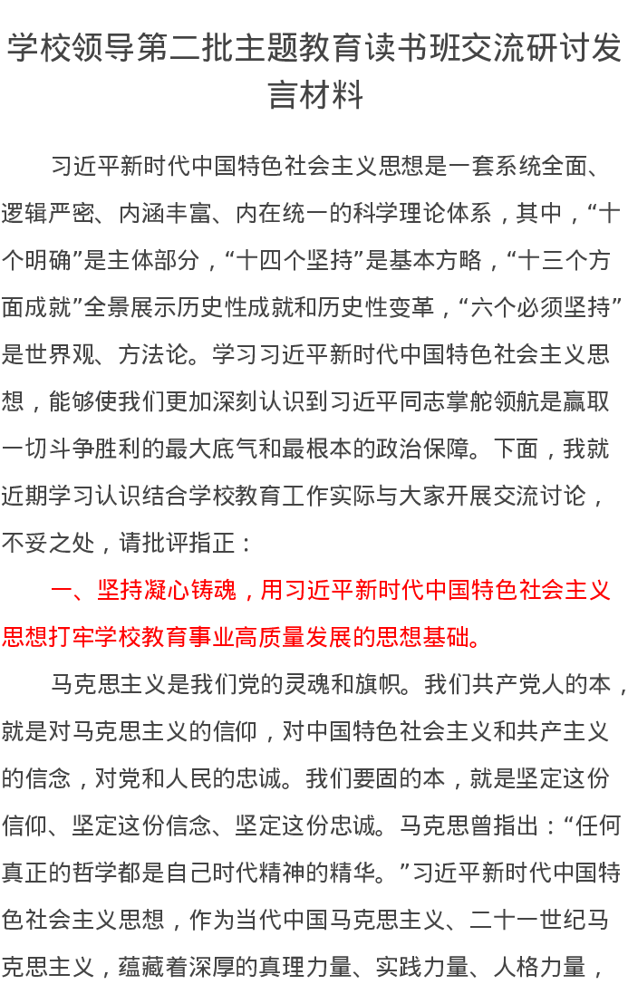 学校领导第二批主题教育读书班交流研讨发言材料(特色社会主义思想)