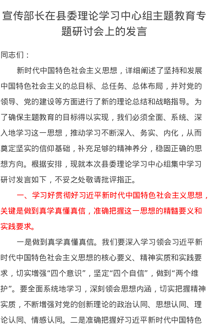 宣传部长在县委理论学习中心组第二批主题教育专题研讨会上的发言(特色社会主义思想)