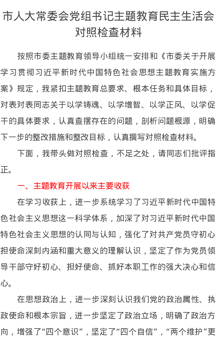 市人大常委会党组书记主题教育民主生活会对照检查材料(特色社会主义思想)