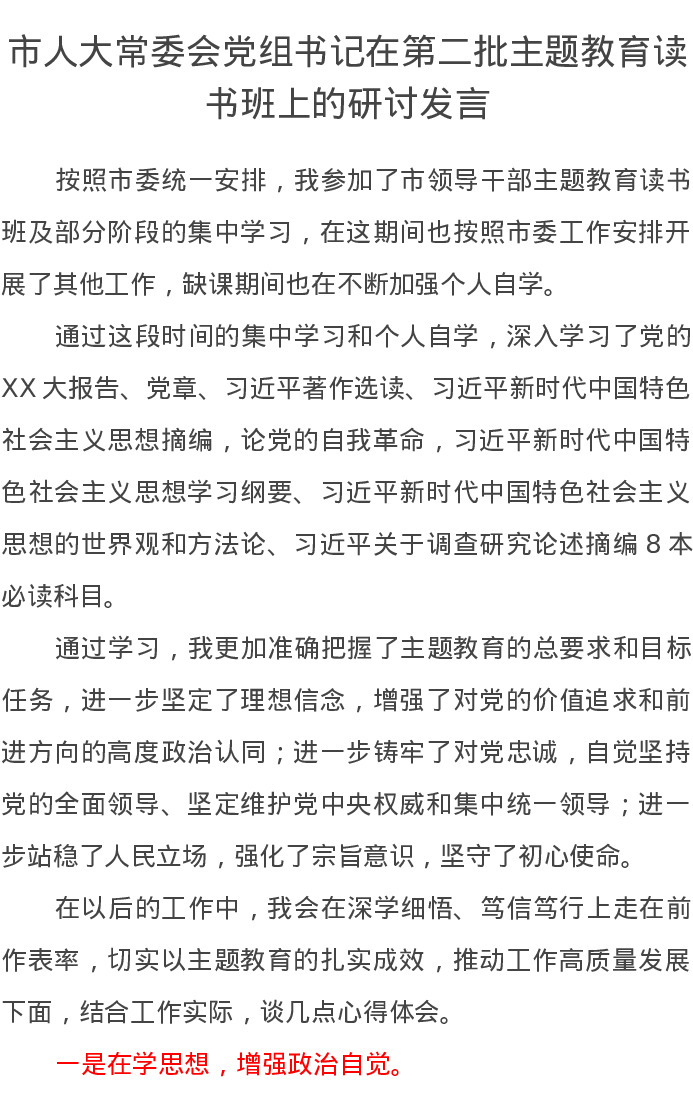 市人大常委会党组书记在第二批主题教育读书班上的研讨发言(特色社会主义思想)