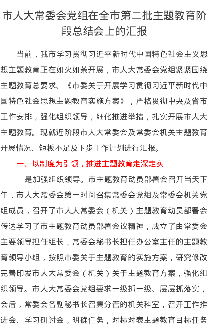 市人大常委会党组在全市第二批主题教育阶段总结会上的汇报(特色社会主义思想)