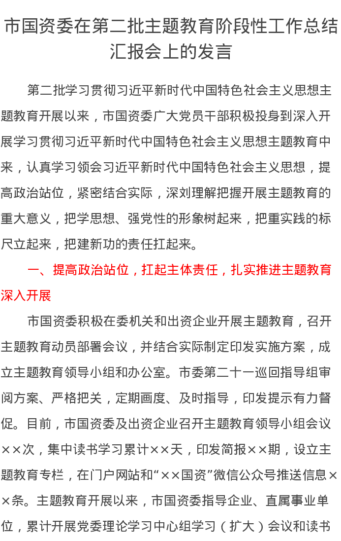市国资委在第二批主题教育阶段性工作总结汇报会上的发言(特色社会主义思想)