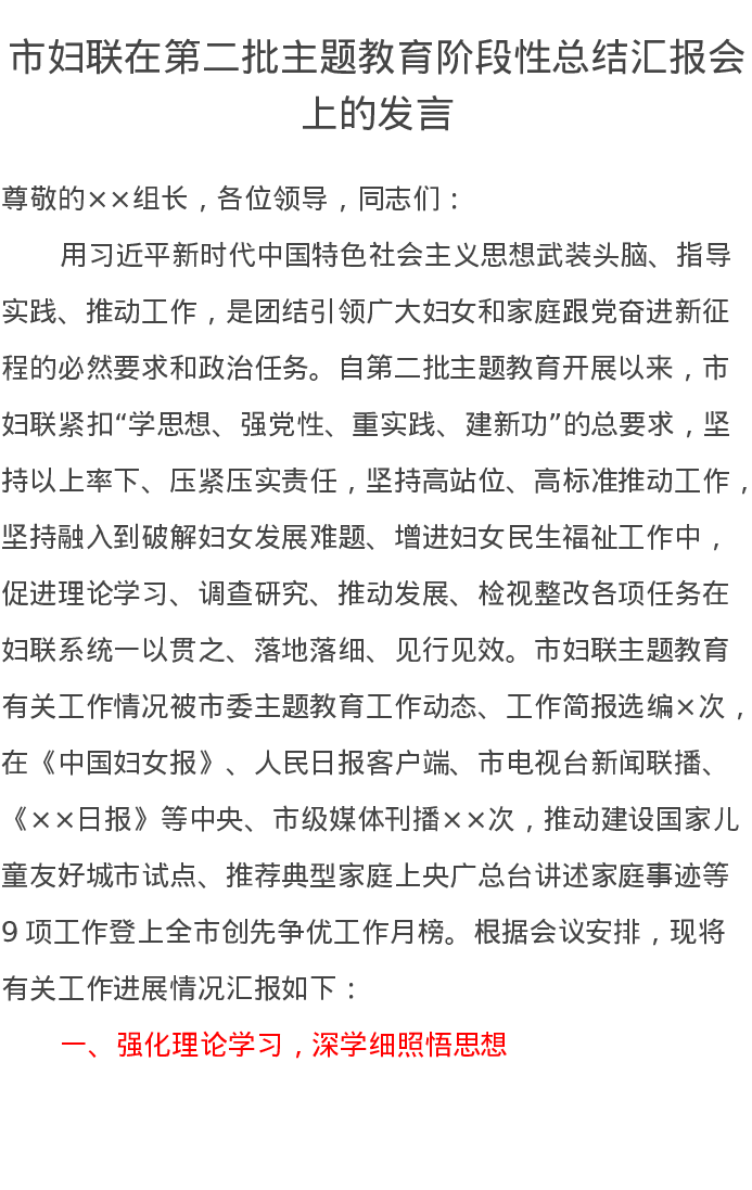 市妇联在第二批主题教育阶段性总结汇报会上的发言(特色社会主义思想)