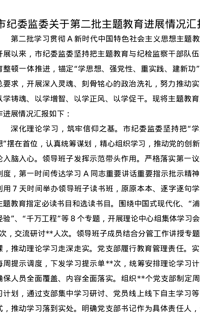 市纪委监委关于第二批主题教育进展情况汇报(特色社会主义思想)