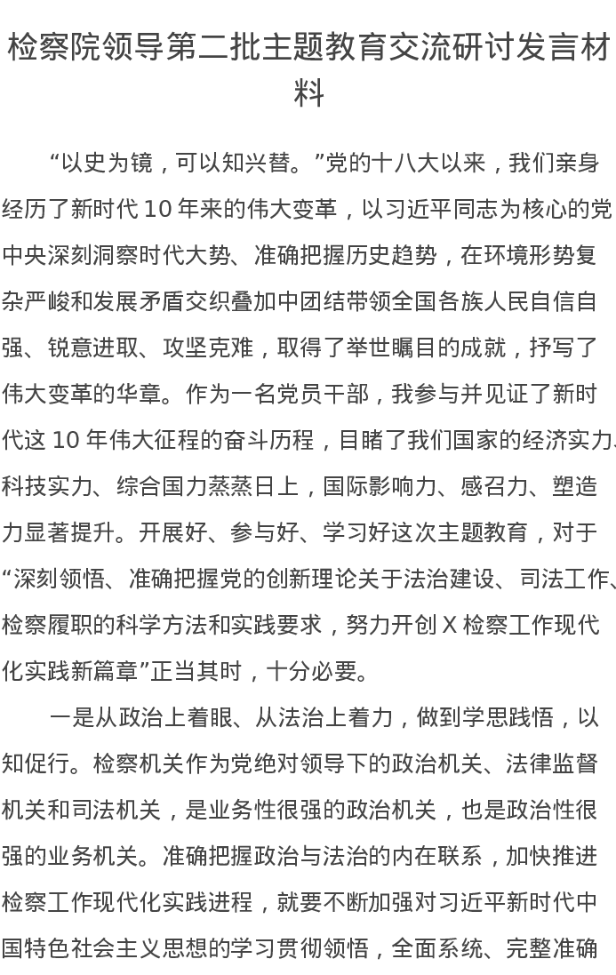检察院领导第二批主题教育交流研讨发言材料(特色社会主义思想)