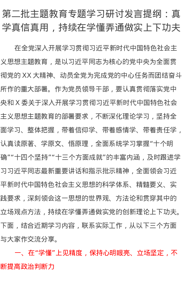 第二批主题教育专题学习研讨发言提纲:真学真信真用,持续在学懂弄通做实上下功夫(特色社会主义思想)