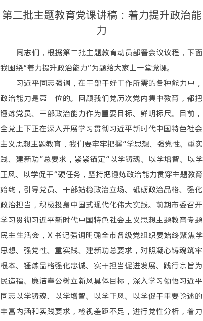 第二批主题教育党课讲稿:着力提升政治能力(特色社会主义思想)
