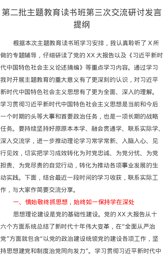 第二批主题教育读书班第三次交流研讨发言提纲(特色社会主义思想)