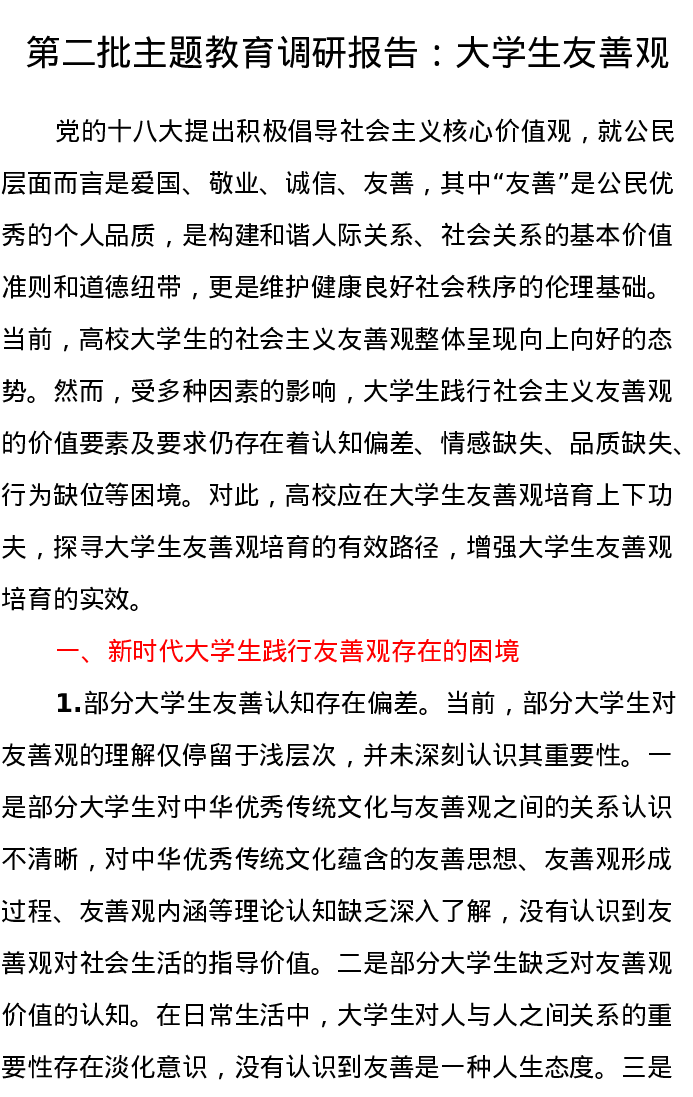 第二批主题教育调研报告:大学生友善观(特色社会主义思想)