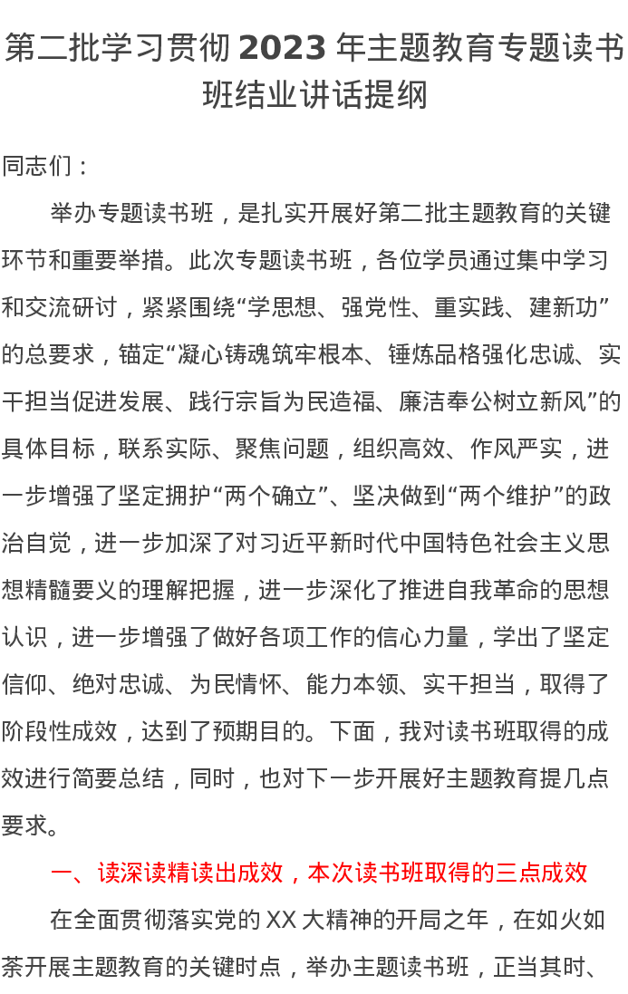 第二批学习贯彻2023年主题教育专题读书班结业讲话提纲(特色社会主义思想)