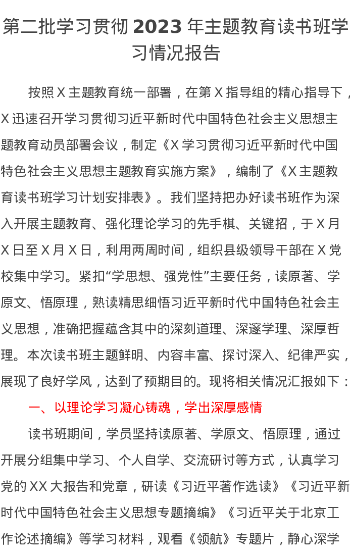 第二批学习贯彻2023年主题教育读书班学习情况报告(特色社会主义思想)