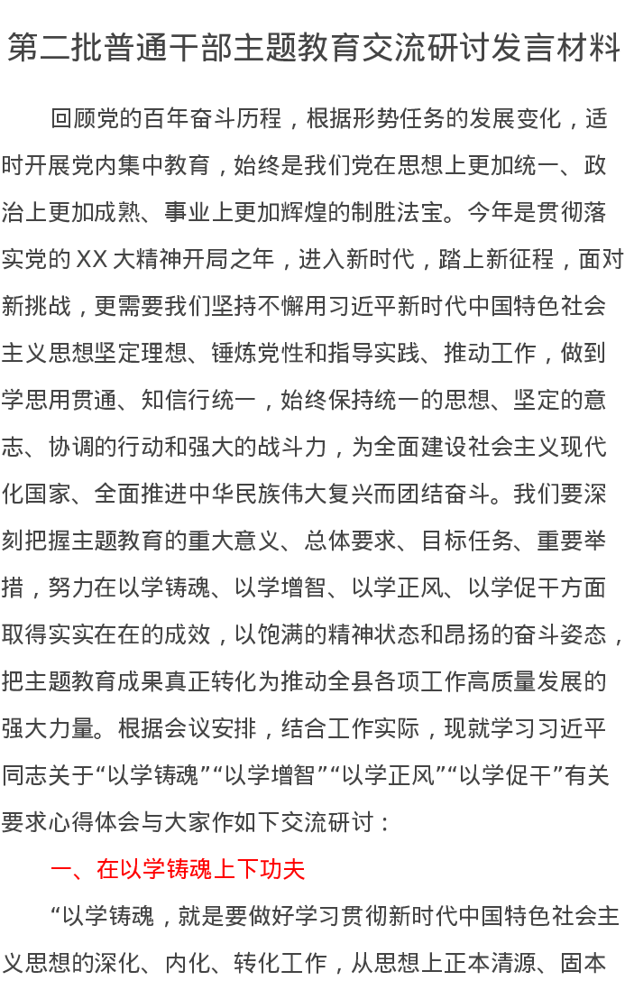 第二批普通干部主题教育交流研讨发言材料(特色社会主义思想)