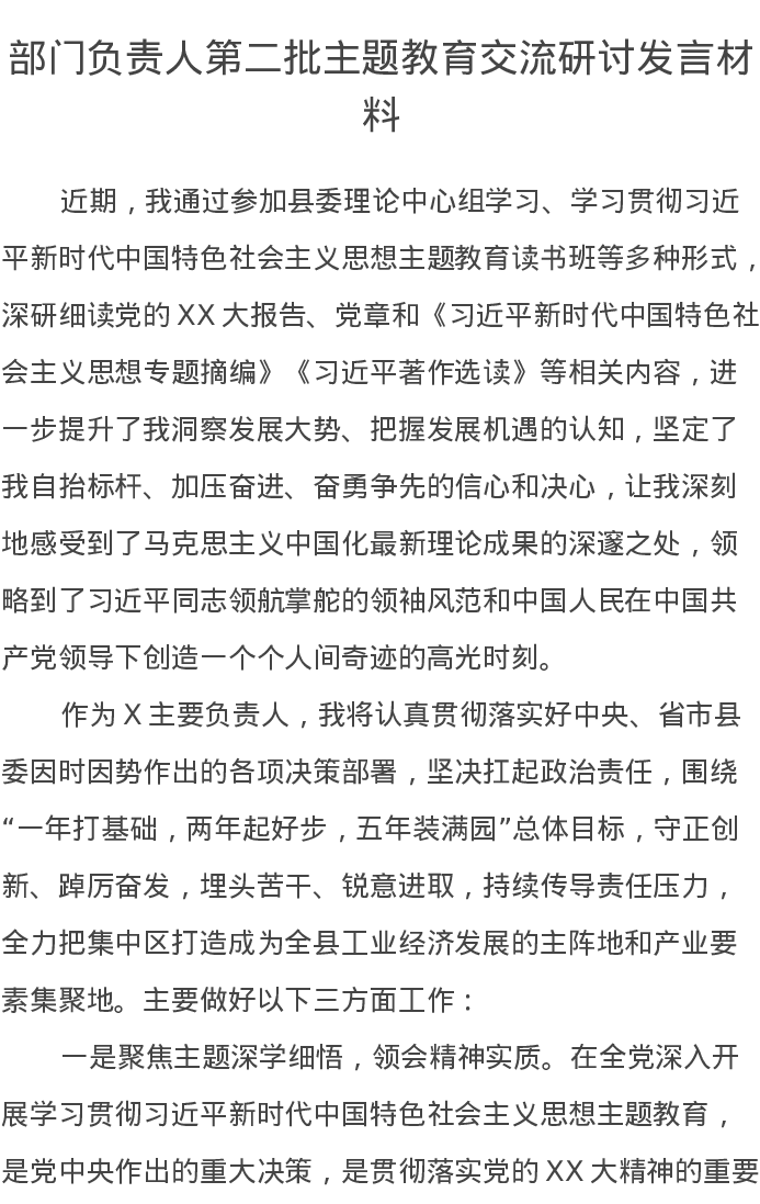 部门负责人第二批主题教育交流研讨发言(特色社会主义思想)