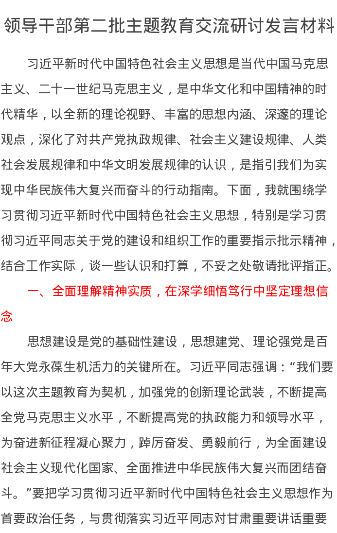 领导干部第二批主题教育交流研讨发言材料(特色社会主义思想)