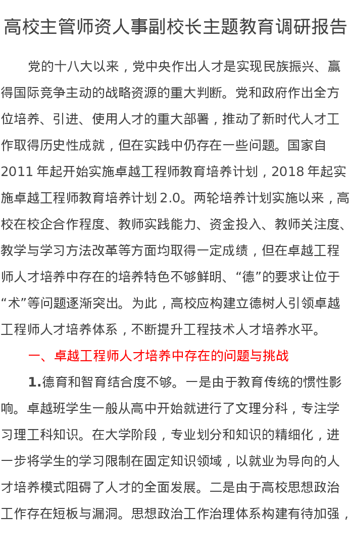 高校主管师资人事副校长主题教育调研报告(特色社会主义思想)