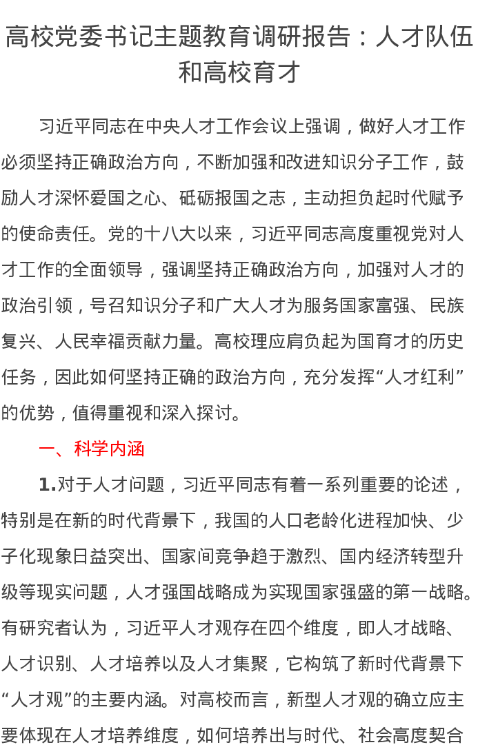 高校党委书记主题教育调研报告:人才队伍和高校育才(特色社会主义思想)
