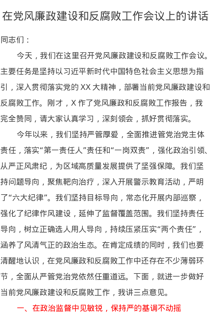 在党风廉政建设和反腐败工作会议上的讲话