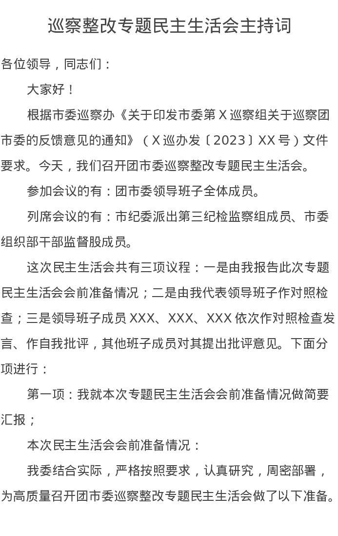 巡察整改专题民主生活会主持词