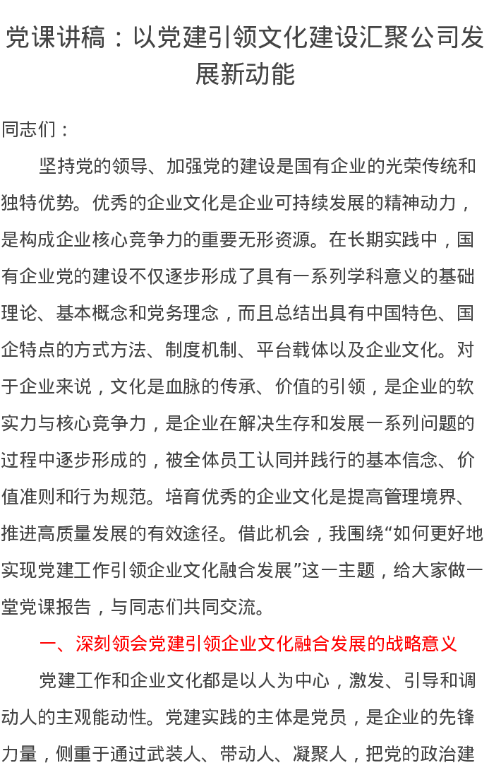 党课讲稿:以党建引领文化建设汇聚公司发展新动能