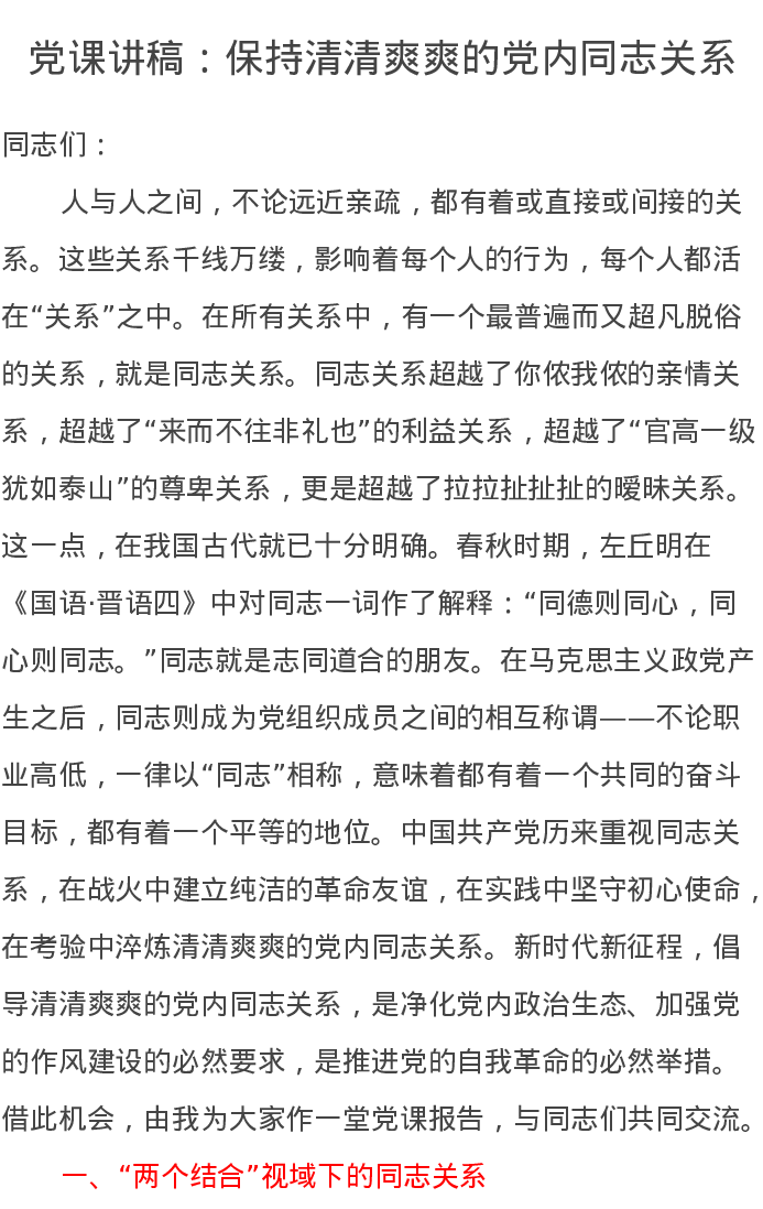 党课讲稿:保持清清爽爽的党内同志关系