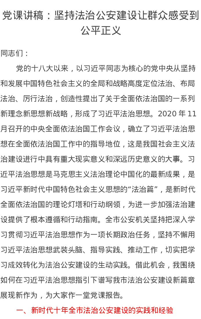 党课讲稿:坚持法治公安建设让群众感受到公平正义