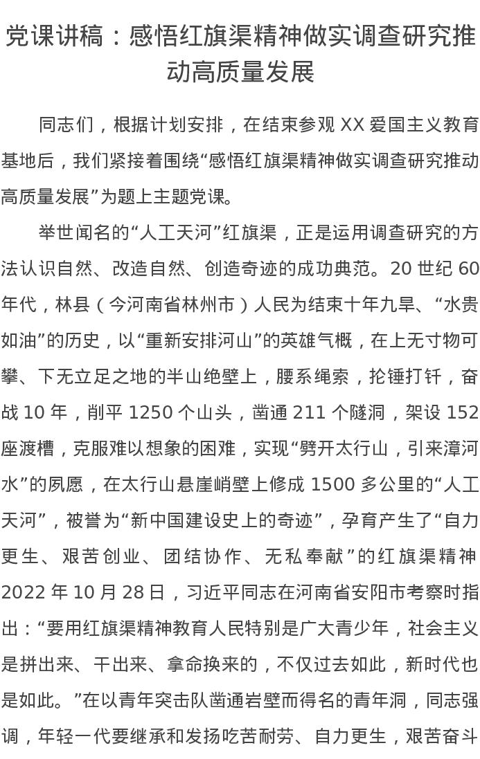 党课讲稿:感悟红旗渠精神做实调查研究推动高质量发展