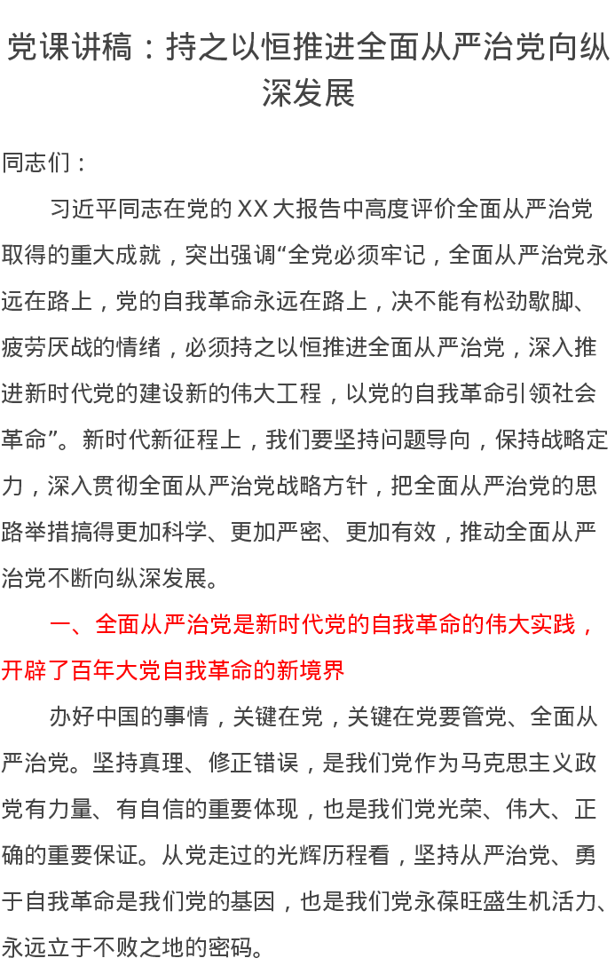 党课讲稿:持之以恒推进全面从严治党向纵深发展