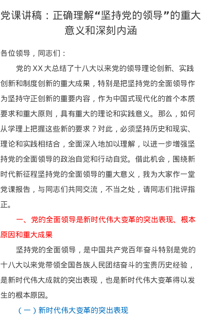 党课讲稿:正确理解“坚持党的领导”的重大意义和深刻内涵