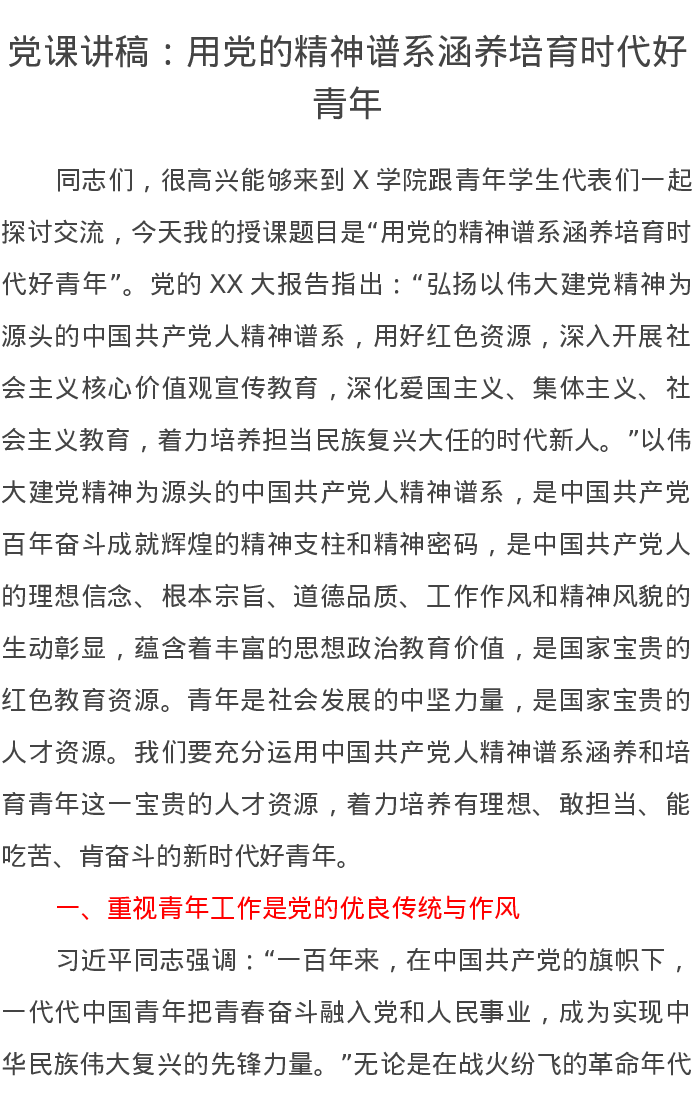 党课讲稿:用党的精神谱系涵养培育时代好青年