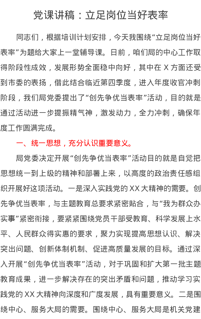 党课讲稿:立足岗位当好表率