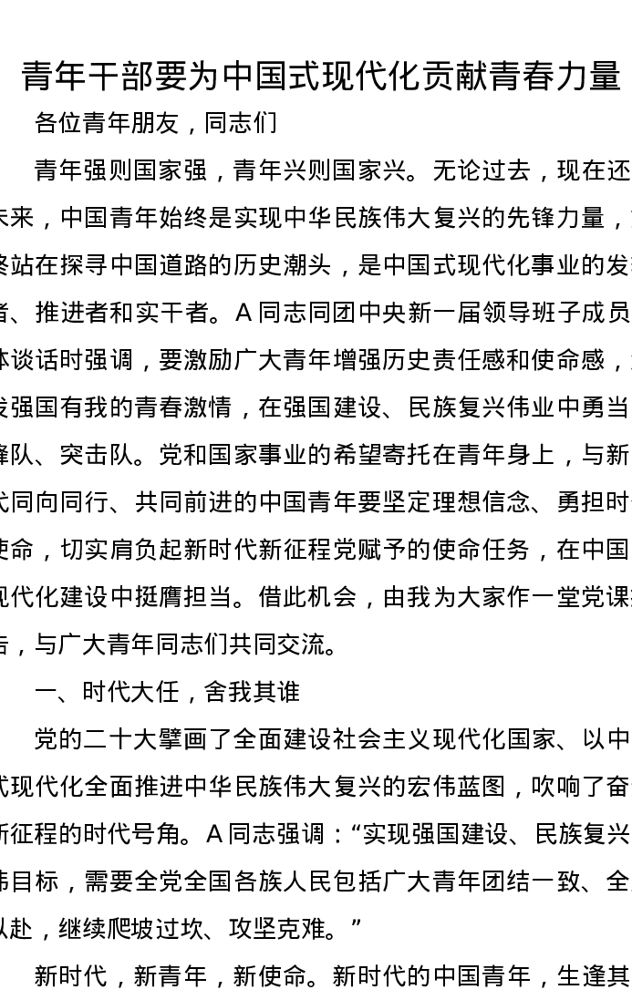 党课讲稿:青年干部要为中国式现代化贡献青春力量