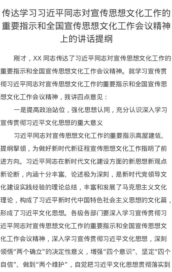 传达学习习近平总书记对宣传思想文化工作的重要指示和全国宣传思想文化工作会议精神上的讲话提纲