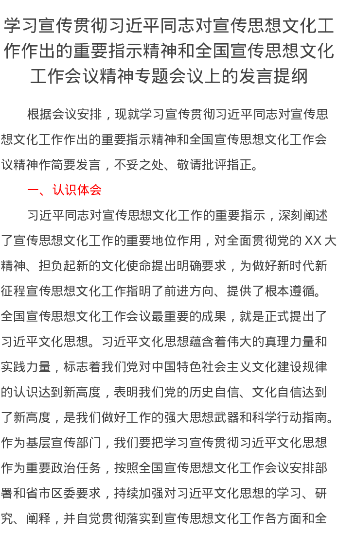 学习宣传贯彻习近平总书记对宣传思想文化工作作出的重要指示精神和全国宣传思想文化工作会议精神专题会议上的发言提纲