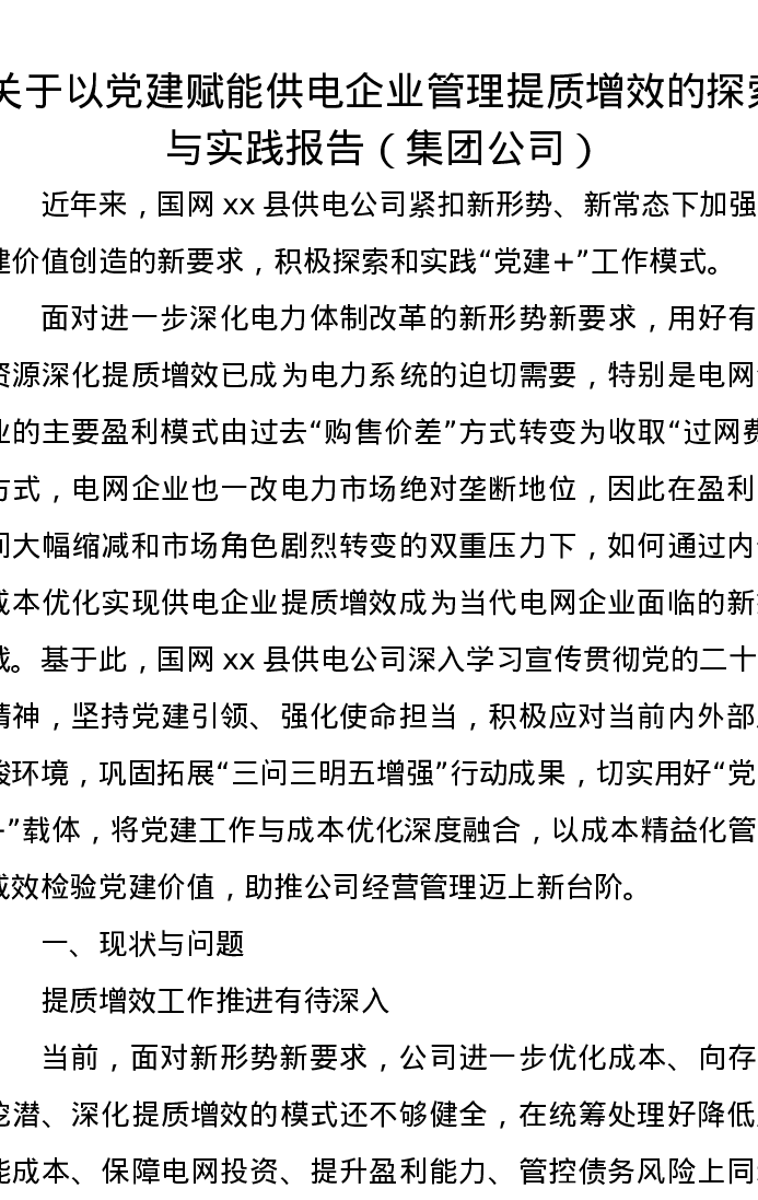 关于以党建赋能供电企业管理提质增效的探索与实践报告(集团公司)
