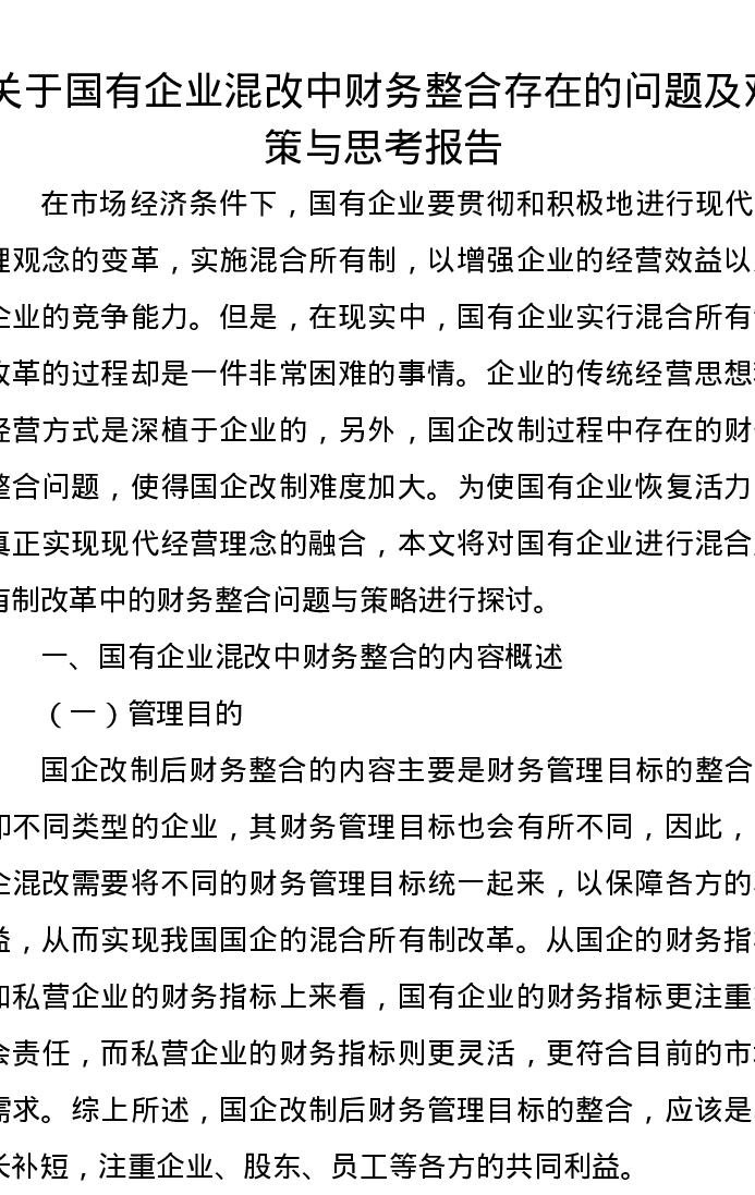 关于国有企业混改中财务整合存在的问题及对策与思考报告