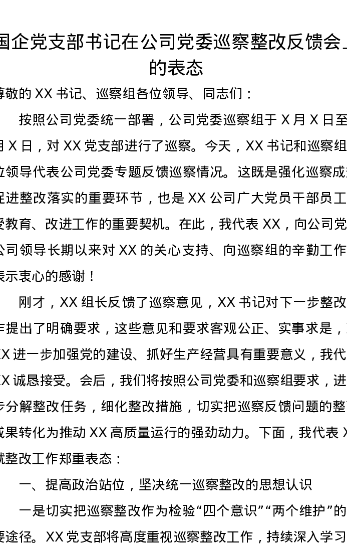 国企党支部书记在公司党委巡察整改反馈会上的表态发言
