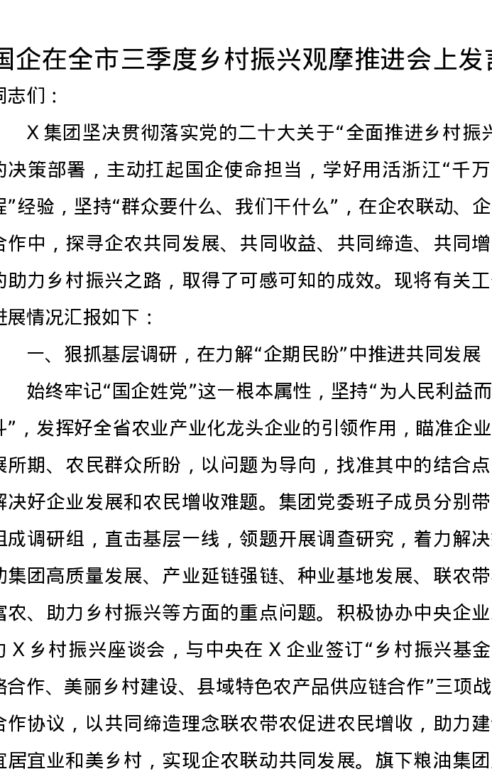 国企在全市三季度乡村振兴观摩推进会上发言