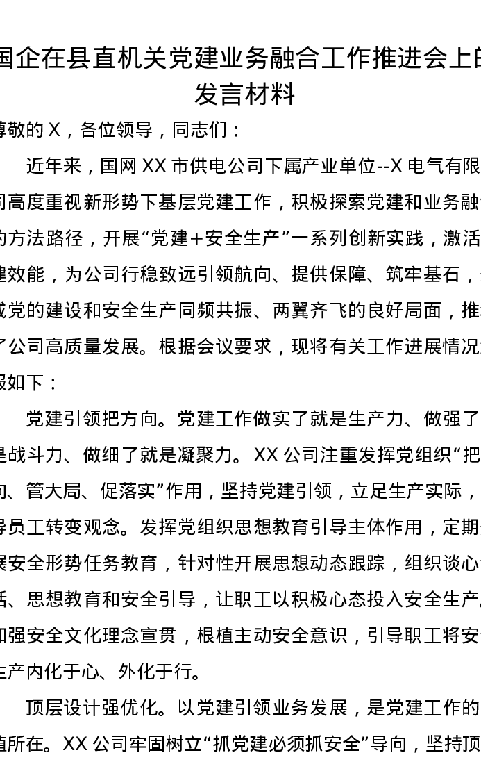 国企在县直机关党建业务融合工作推进会上的发言材料
