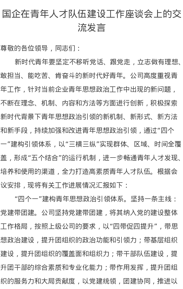 国企在青年人才队伍建设工作座谈会上的交流发言