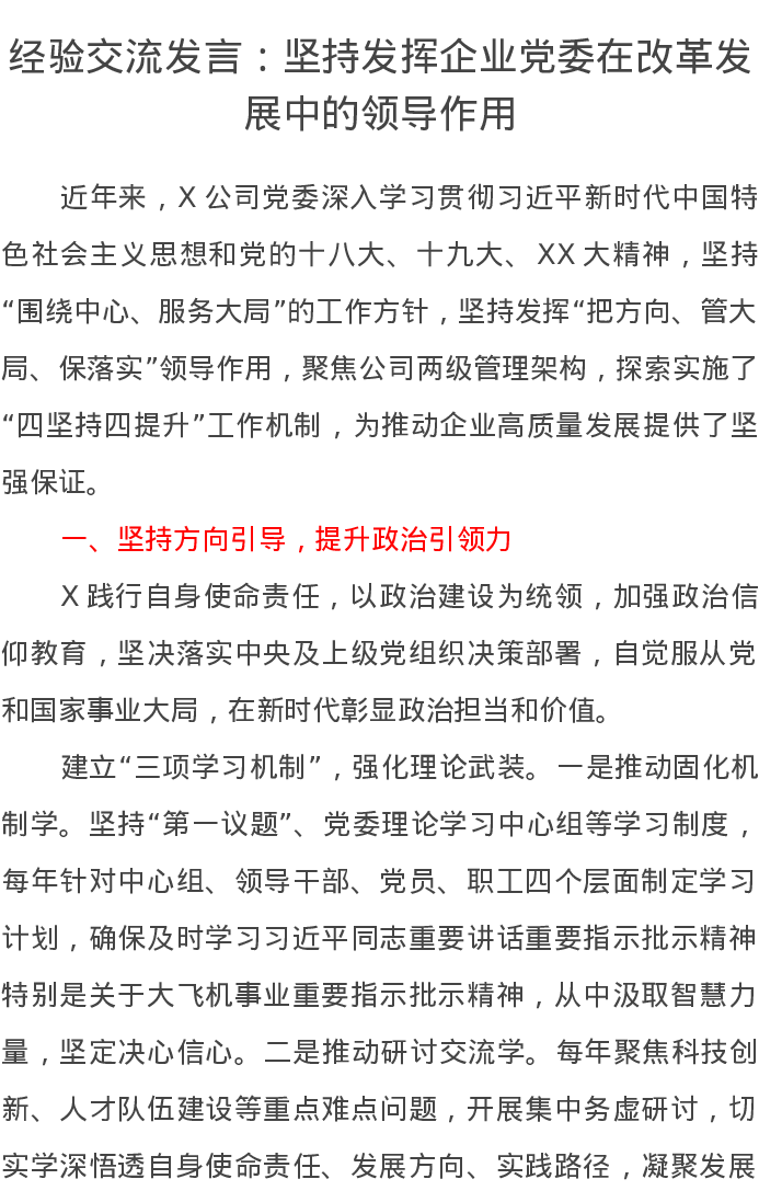 经验交流发言:坚持发挥企业党委在改革发展中的领导作用