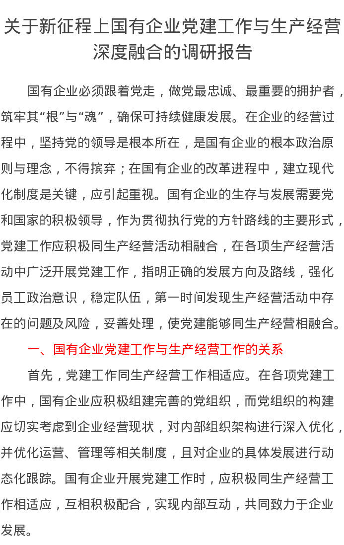关于新征程上国有企业党建工作与生产经营深度融合的调研报告