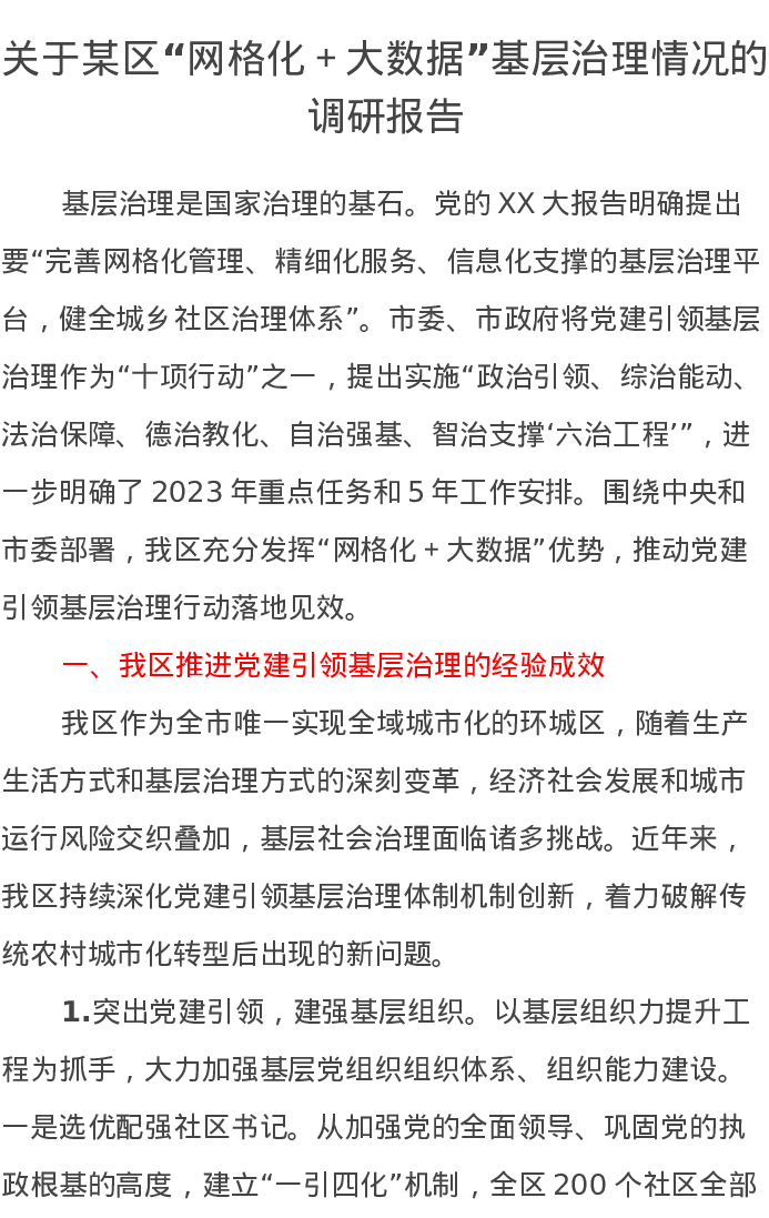 关于某区“网格化+大数据”基层治理情况的调研报告