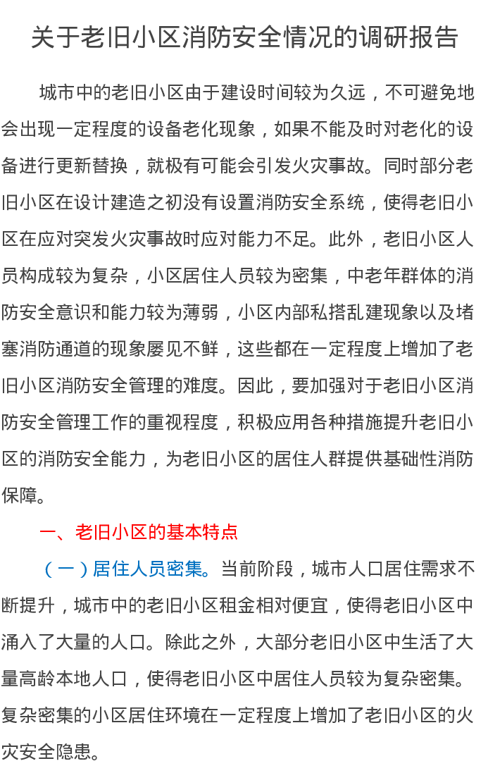 关于老旧小区消防安全情况的调研报告