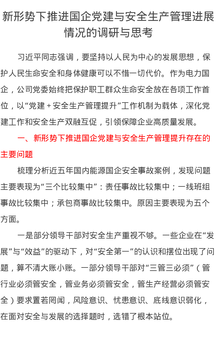 新形势下推进国企党建与安全生产管理进展情况的调研与思考报告