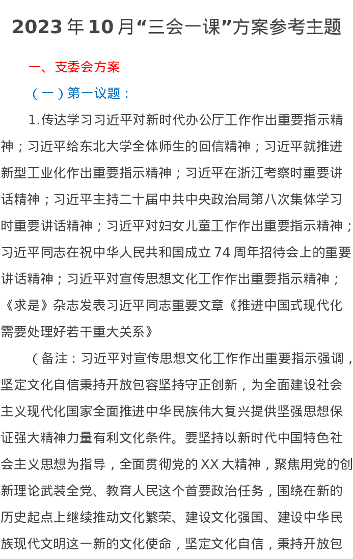 2023年10月“三会一课”方案参考主题